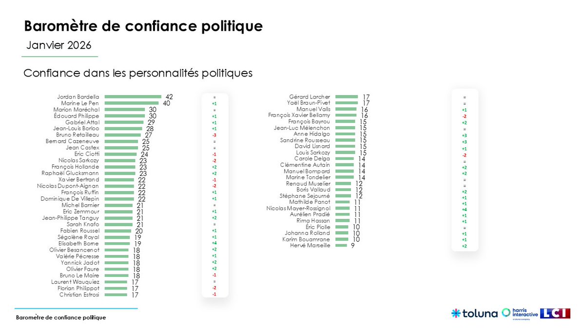Bon, il faut raison garder ce classement montre surtout que les français eux même n’ont pas confiance du tout dans leur classe politique. Le premier à 42% , on est vite en dessous de 30 voire 20 % d’opinion favorable ensuite ![]()