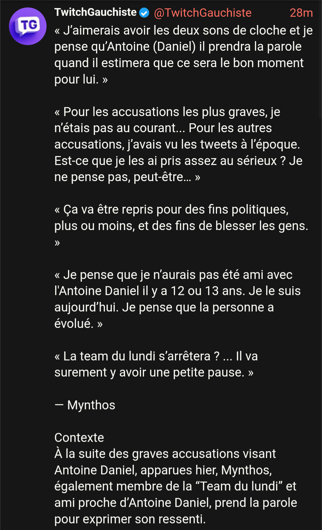 Son chat twitch et discorde était fermé ce matin. Suis allé 2mn sur le live de Mynthos qui disait prendre une pause sur le live du lundi (live où on retrouve généralement Antoine daniel, JDG, zerator).