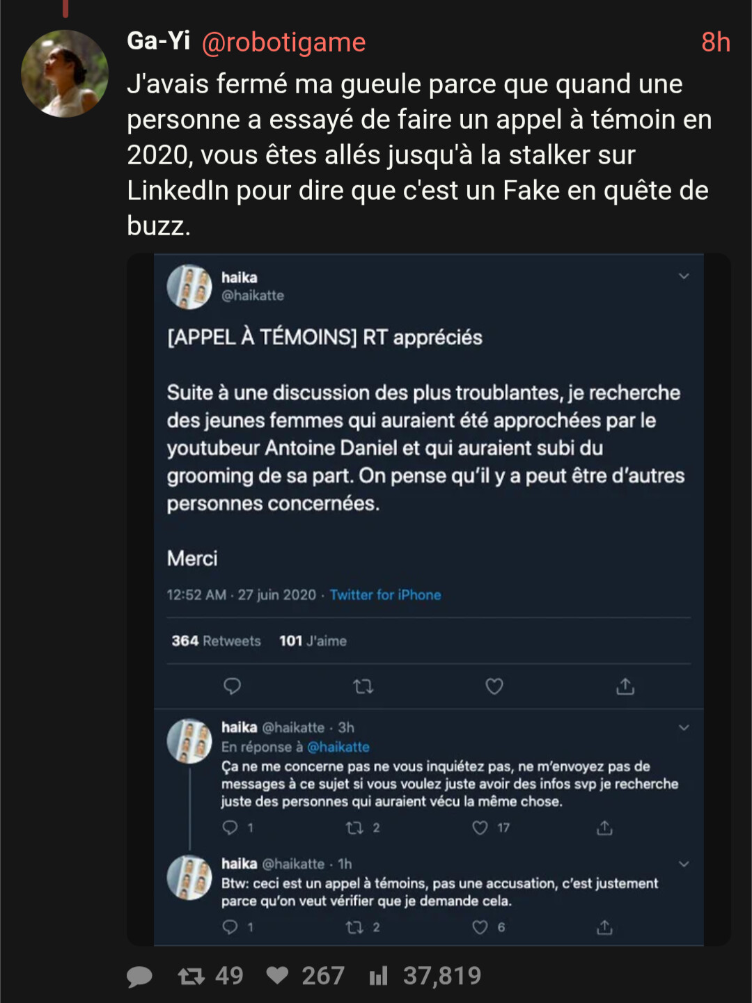 Encore une nouvelle cascade. Cette fois, celle-ci propose deux personnalités : le teubé qui a rédigé le premier tweet et Antoine Daniel qui serait dans une shitstorm.