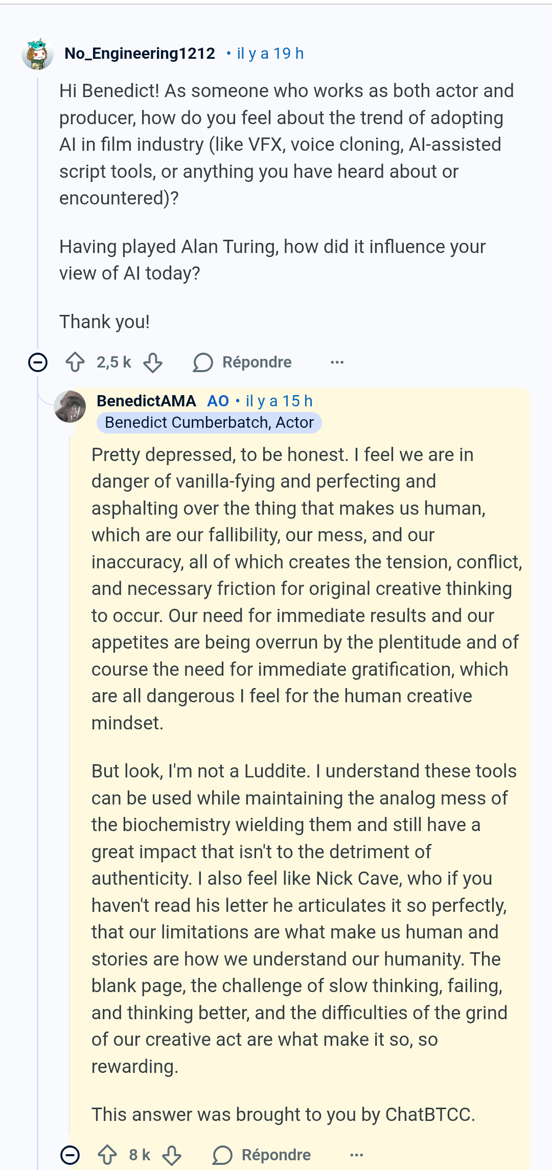 Benedict Cumberbatch qui répond à un AMA sur Reddit: