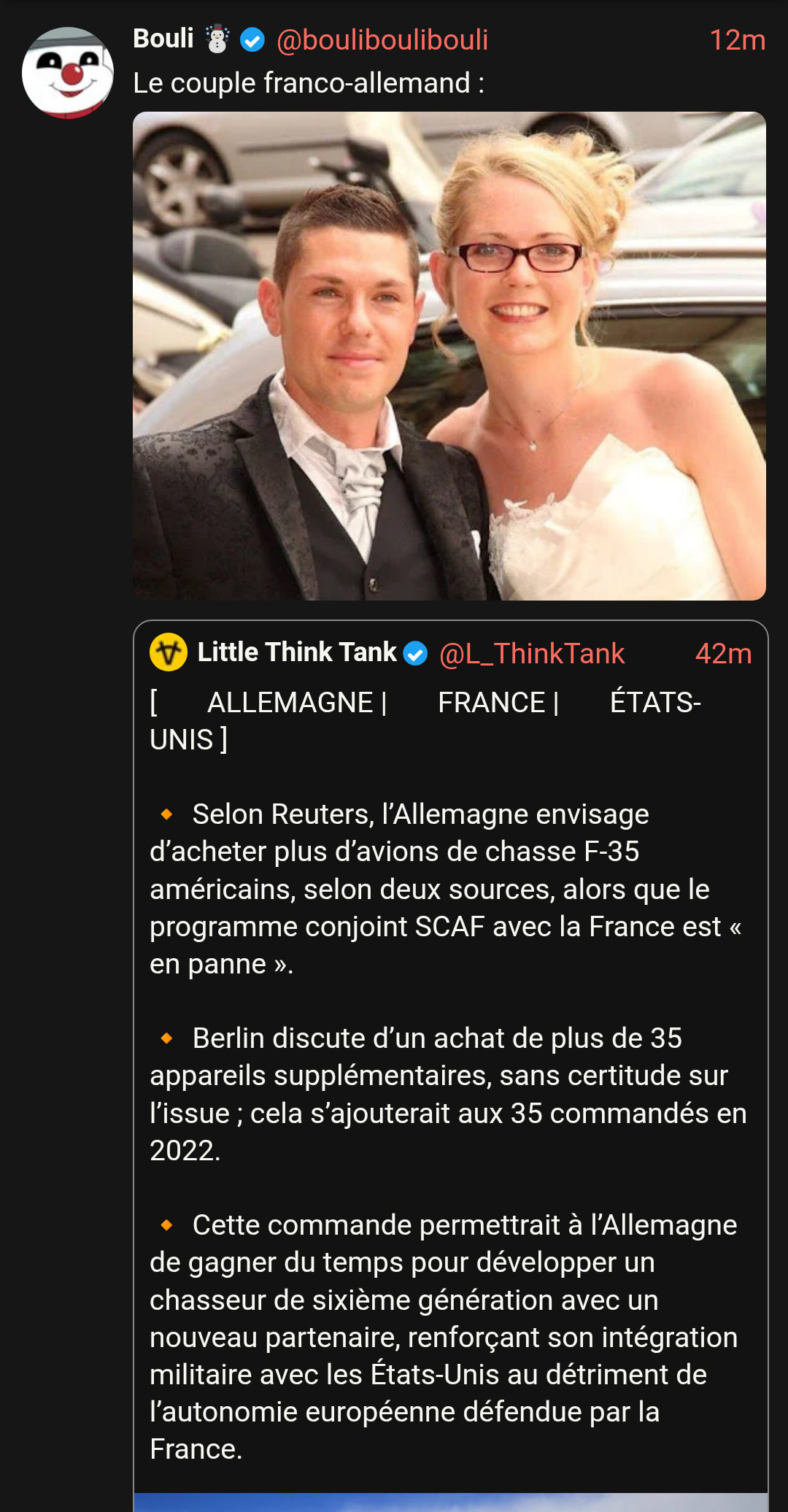 Mais les allemands sont absolument atlantistes de toute façon. Encore la semaine derniĂšre quand Macron parlait dâautonomie stratĂ©gique europĂ©enne, Merz expliquait quâil Ă©tait essentiel de garder le lien transatlantique.